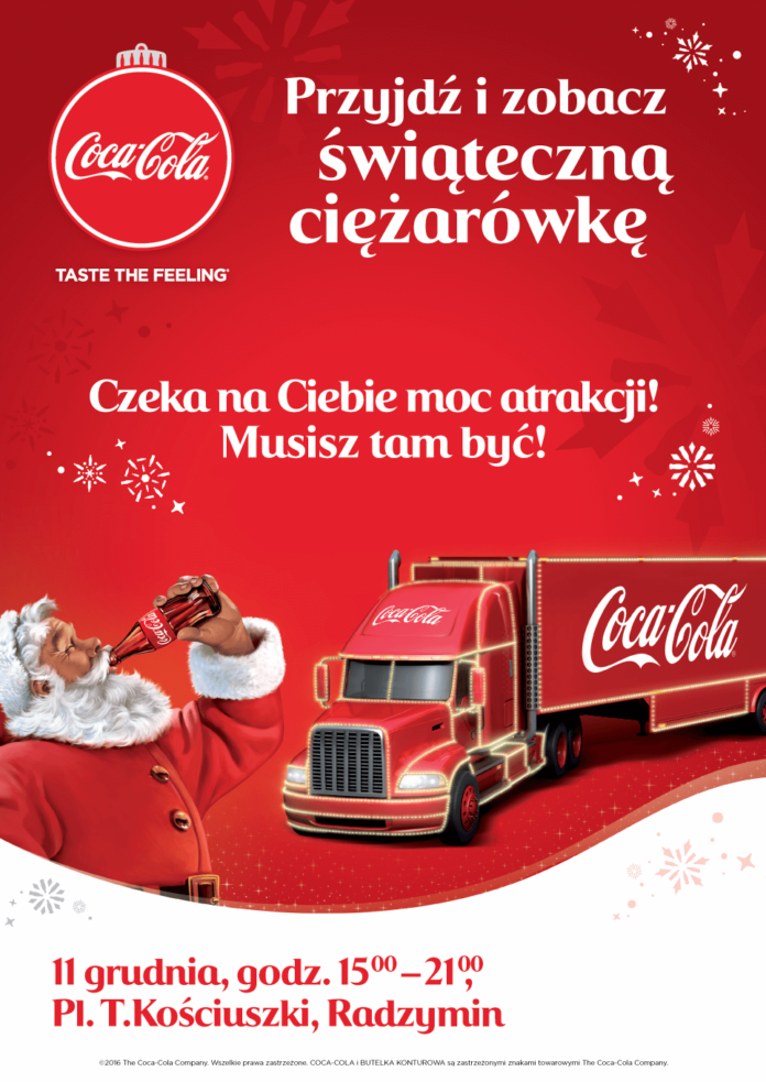 Coca-Cola zaprasza mieszkańców Radzymina do radosnej zabawy z rodziną i znajomymi! 11 grudnia podczas imprezy w godz. 15-21 będzie można m.in. zrobić zdjęcie w klimatycznym Pokoju Świętego Mikołaja, z kultową ciężarówką Coca-Cola, własnoręcznie przygotować prezent w „fabryce upominków”, wysłać bliskim pocztówkę z życzeniami ze zdjęciem z foto-budki, czy przygotować spersonalizowaną puszkę Coca-Cola. Fani nowych technologii będą mogli doświadczyć wirtualnej przejażdżki saniami Świętego Mikołaja zakładając specjalne okulary oculus. Nie zabraknie też konkursów i gier z nagrodami. Dlaczego to wszystko? Bo w nadchodzącym czasie Coca-Cola pragnie każdemu podarować radość!