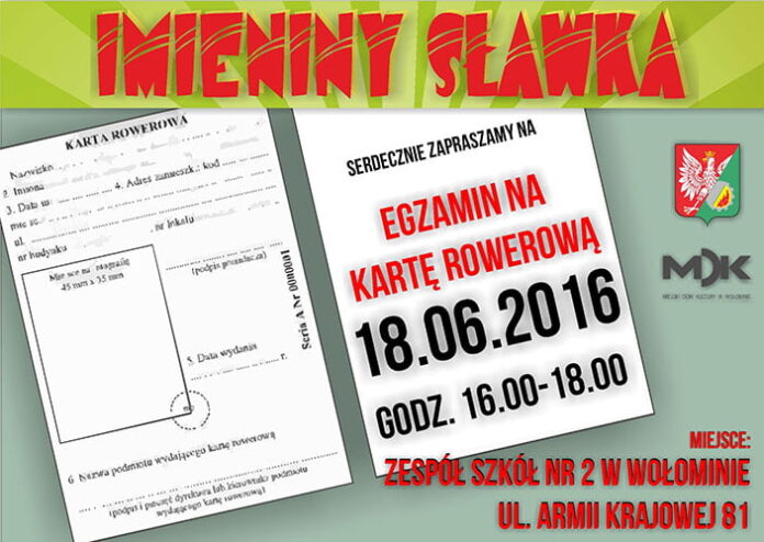 Podczas Festynu „Imieniny Sławka” można będzie przystąpić do egzaminu na KARTĘ ROWEROWĄ. Wszystkich zainteresowanych zapraszamy do Zespołu Szkół nr 2 w Wołominie, 18 czerwca w godzinach 16-18.