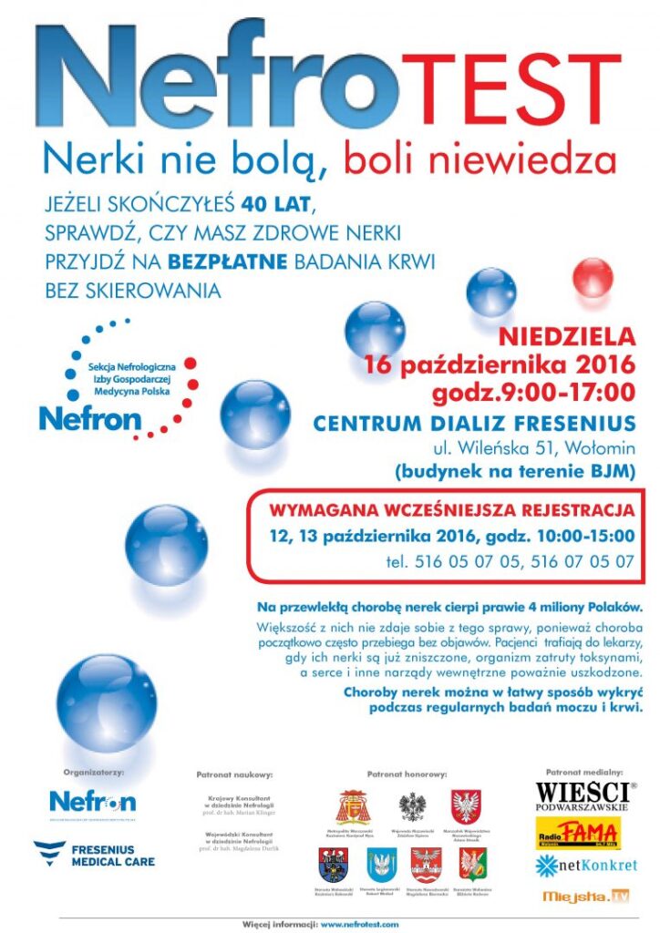 Rozpoczyna się akcja NEFROTEST w Wołominie. Już 16 października br. odbędą się bezpłatne badania krwi dla osób powyżej 40. roku życia, pozwalające wykryć schorzenia nerek we wczesnych stadiach.