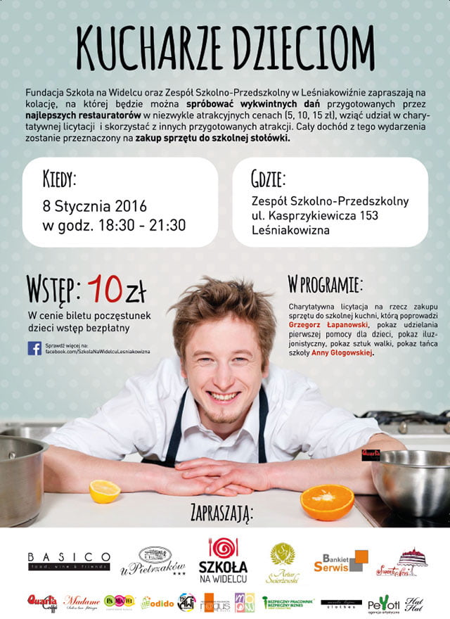 Zapraszamy na drugą w Polsce kolację charytatywną pod hasłem „Kucharze dzieciom”. W ramach akcji szefowie kuchni i miłośnicy gotowania przygotowują swoje ulubione posiłki, a Ty możesz ich spróbować w dobrej cenie (5, 10, 15 zł). Cały dochód z tego przedsięwzięcia zostanie przeznaczony na wsparcie sprzętowe dla szkolnych stołówek.