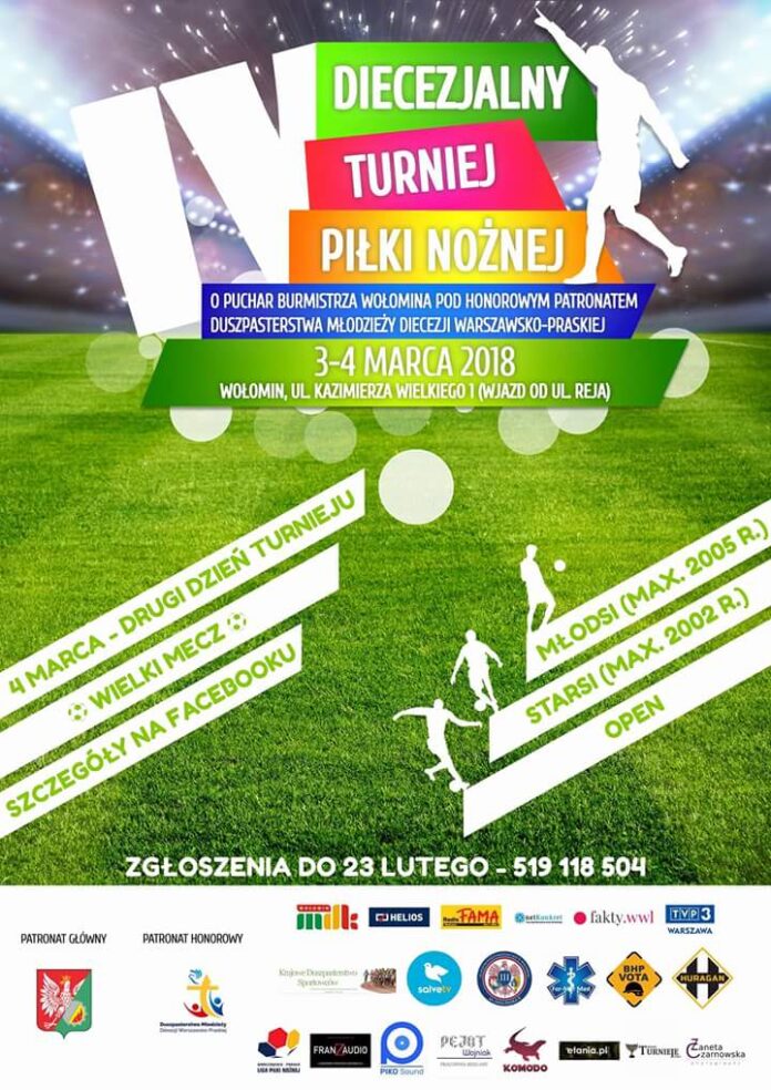 Już po raz czwarty drużyny z Diecezji Warszawsko-Praskiej zagoszczą do naszego miasta, by powalczyć o Puchar Burmistrza Wołomina Elżbiety Radwan, medale i inne atrakcyjne nagrody w turnieju piłki nożnej, który odbędzie się w weekend 3-4 marca 2018 roku na orliku sportowym przy III LO im. Jana Pawła II w Wołominie przy ul. Kazimierza Wielkiego 1 (wjazd od ul. Reja).