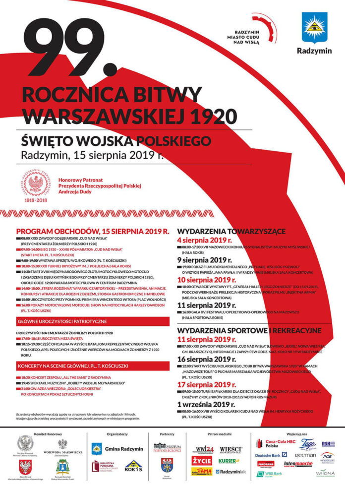 Z okazji święta 15 sierpnia Radzymin zaprasza na uroczystości patriotyczne, które rozpoczną się o godz. 17:00 od Mszy Świętej na Cmentarzu Żołnierzy Polskich 1920, po których nastąpi część oficjalna i Apel Poległych. Gmina Radzymin przygotowała też bogaty programie wydarzeń kulturalnych i rekreacyjnych. W tym dniu z Radzymina wystartuje XXVIII półmaraton „Bieg 1920”, przez miasto przejedzie parada tysiąca motocykli z XVIII Zlotu MotoCud, a gwiazdą wieczoru będzie zespół „Golec uOrkiestra”.