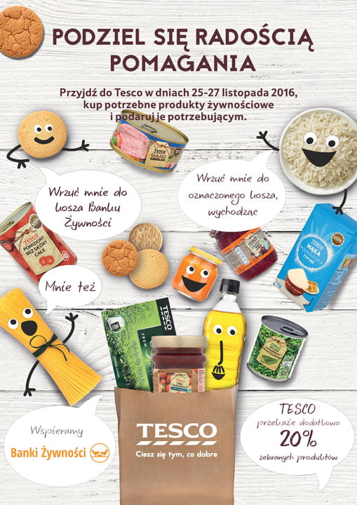 i pozyskując niemal 10% wolumenu wszystkich zbiórek Banków Żywności przeprowadzanych w sieciach handlowych. W akcję włączają się także sklepy Tesco w Czechach, na Słowacji i Węgrzech – w minionym roku w Europie Środkowej w zbiórki zaangażowało się 547 placówek, zaś klienci przekazali 419 ton żywności, z której przygotowano 1 046 088 posiłków dla potrzebujących.