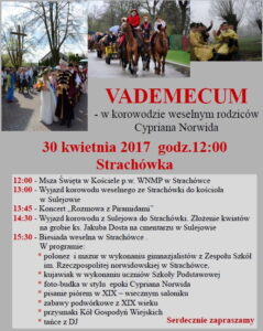 AktualnościW korowodzie weselnym rodziców C.K. Norwida 2017Przez Redakcja - 28 kwietnia 20170432FacebookTwitterPinterestWhatsApp Stowarzyszenie Rzeczpospolita Norwidowska, Wójt Gminy Strachówka, Starosta Wołomiński zapraszają 30 kwietnia 2017 do Strachówki na imprezę plenerową VADEMECUM – w korowodzie weselnym rodziców Cypriana Norwida