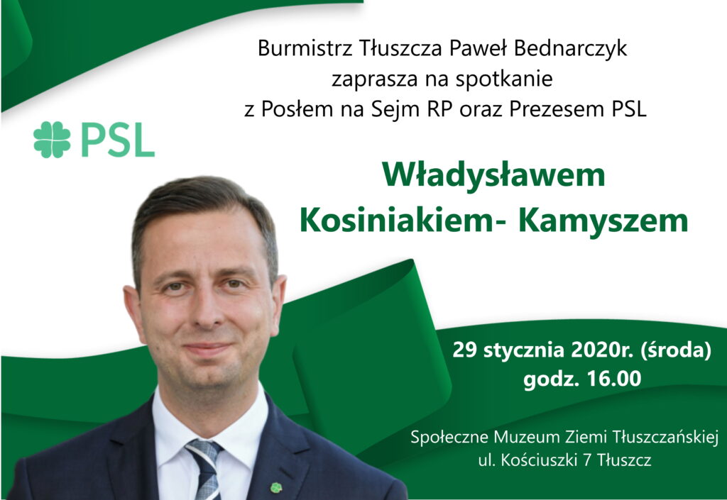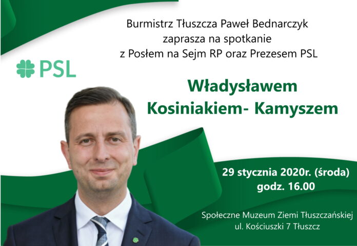 Zapowiedzi wydarzeńWładysław Kosiniak-Kamysz odwiedzi TłuszczPrzez Redakcja - 22 stycznia 20200541FacebookTwitterPinterestWhatsApp Prezes PSL i poseł na Sejm RP Władysław Kosiniak-Kamysz na zaproszenie Burmistrza Tłuszcza Pawła Bednarczyka będzie gościł w Społecznym Muzeum Ziemi Tłuszczańskiej, gdzie 29 stycznia 2020 roku spotka się z mieszkańcami gminy i powiatu