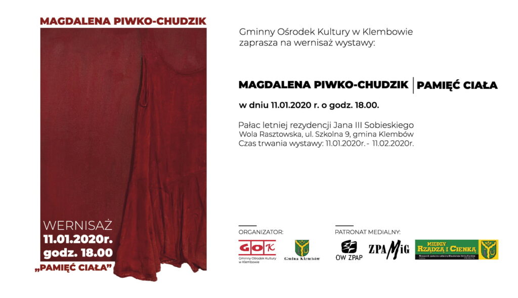 Gminny Ośrodek Kultury w Klembowie zaprasza na wernisaż do odnowionych pomieszczeń Pałacu w Woli Rasztowskiej – letniej rezydencji Jana III Sobieskiego. Rozpoczynający się 11 stycznia br. wernisaż Magdaleny Piwko-Chudzik p.t. „Pamięć ciała”będzie pierwszym wydarzeniem artystycznym w odremontowanych wnętrzach pałacu.