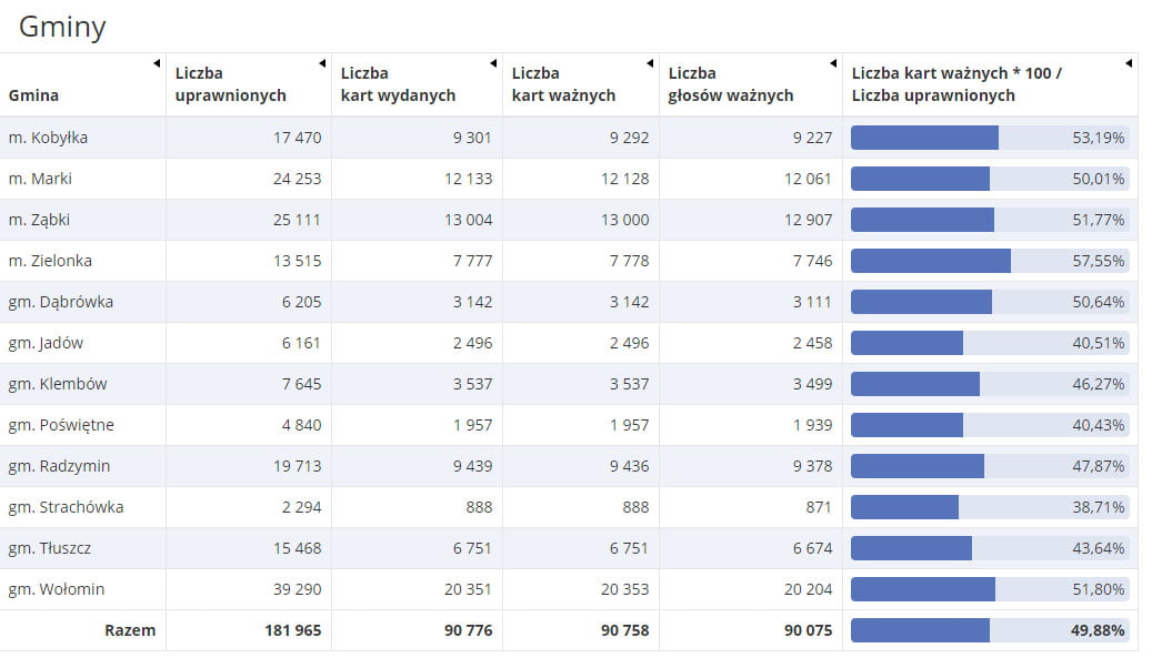 W 12 gminach powiatu wołomińskiego frekwencja osiągnęła poziom 49,88%. Najwyższa była w Zielonce (57,55%), a najniższa w gminie Strachówka (38,71%).