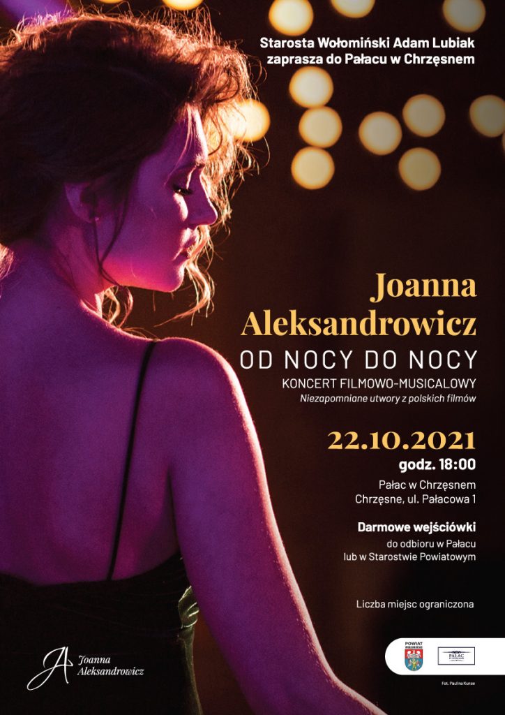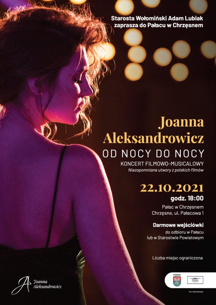 Starosta Wołomiński Adam Lubiak zaprasza do Pałacu w Chrzęsnem na koncert Joanny Aleksandrowicz „Od nocy do nocy”.